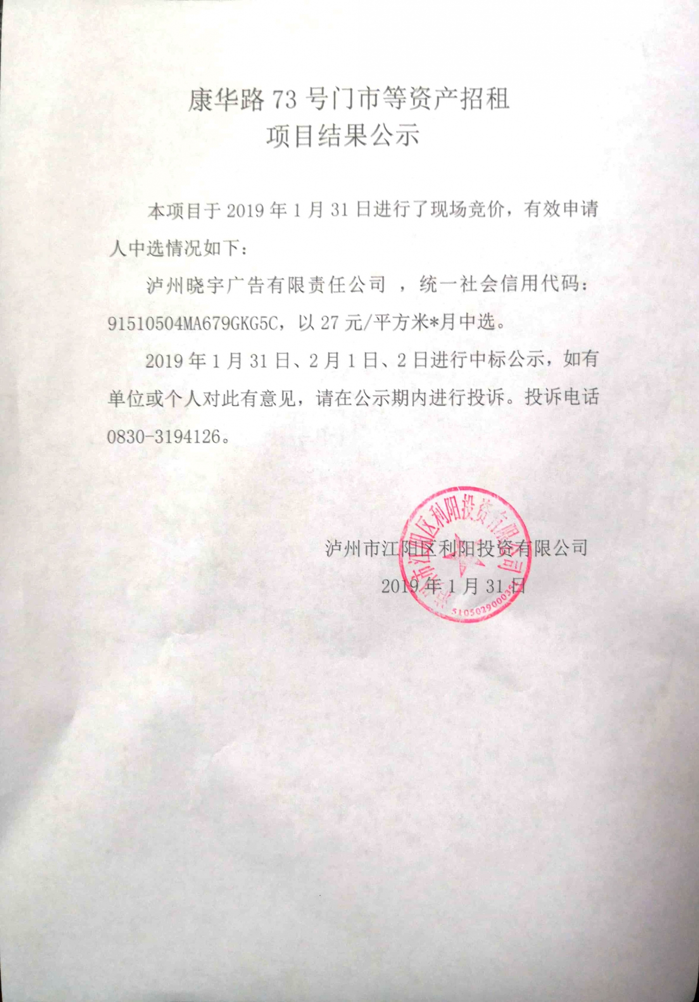 来源:泸州市江阳区利阳投资有限公司 发布时间:2019-01-31