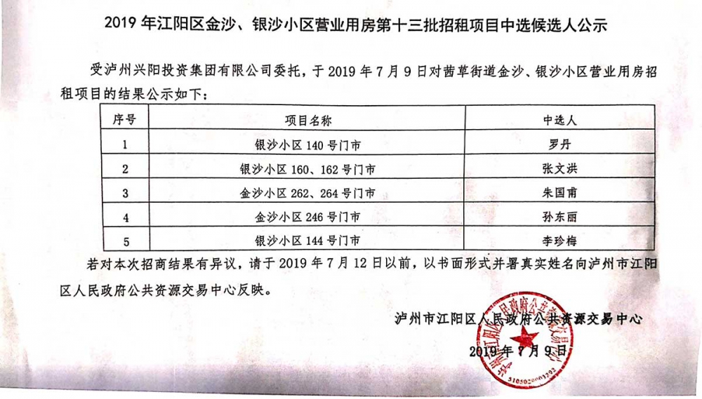 2019年江阳区金沙、银沙小区营业用房第十三批招租项目中选候选人公示