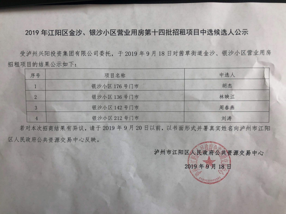2019年江阳区金沙、银沙小区营业用房第十四批招租项目中选候选人公示