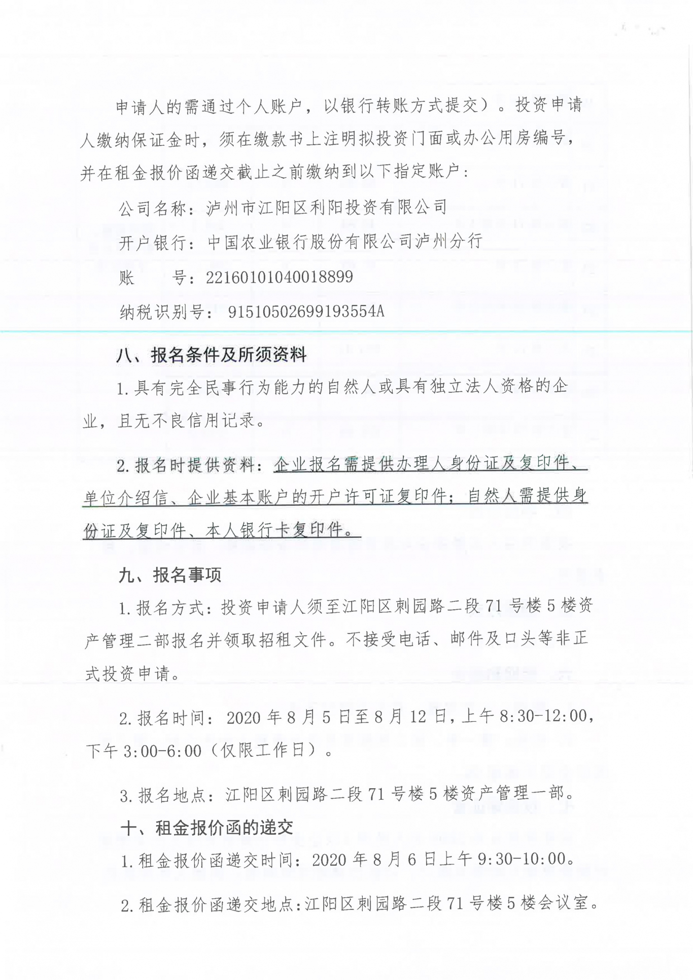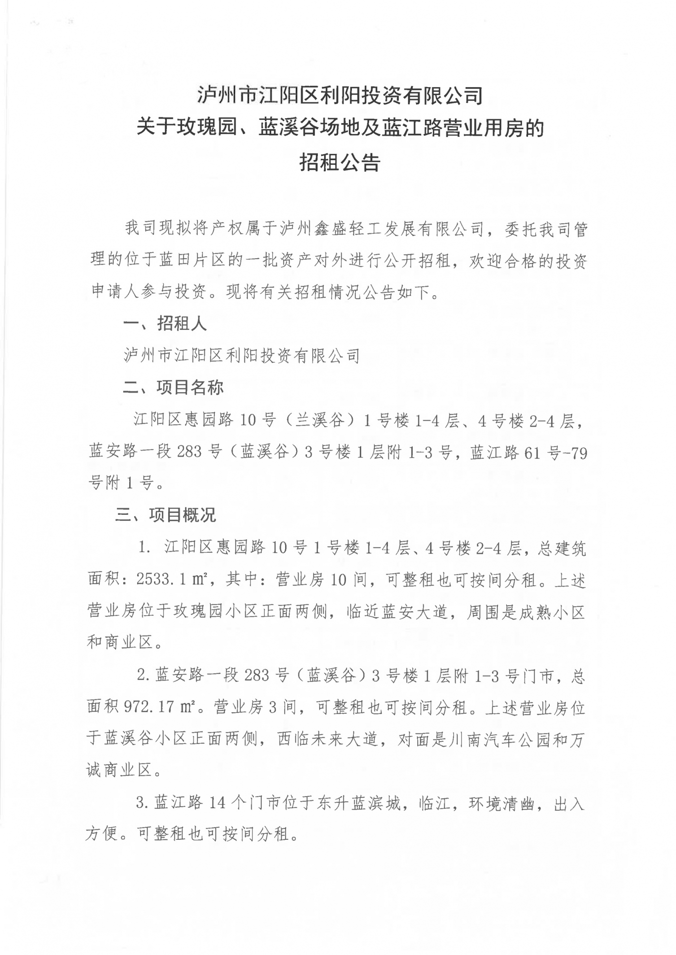 泸州市江阳区利阳投资有限公司关于玫瑰园、蓝溪谷场地及蓝江路营业用房的招租公告