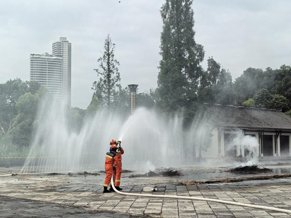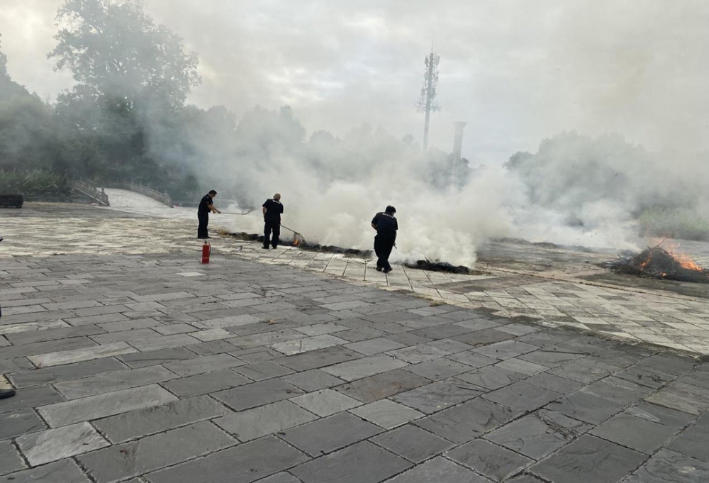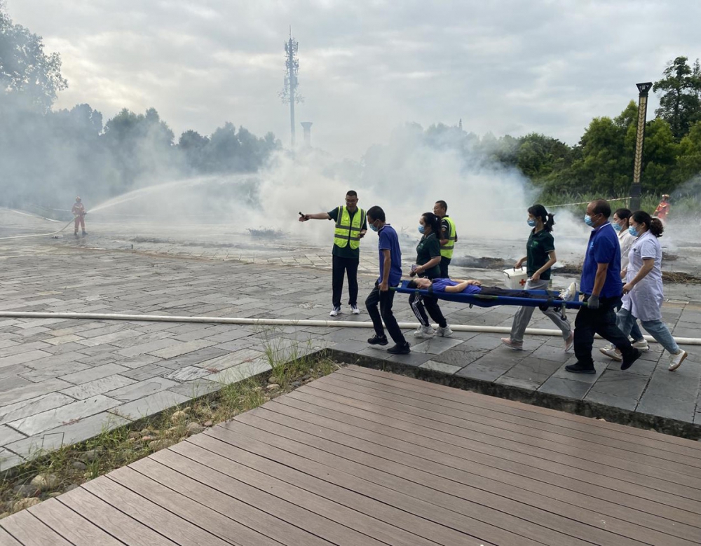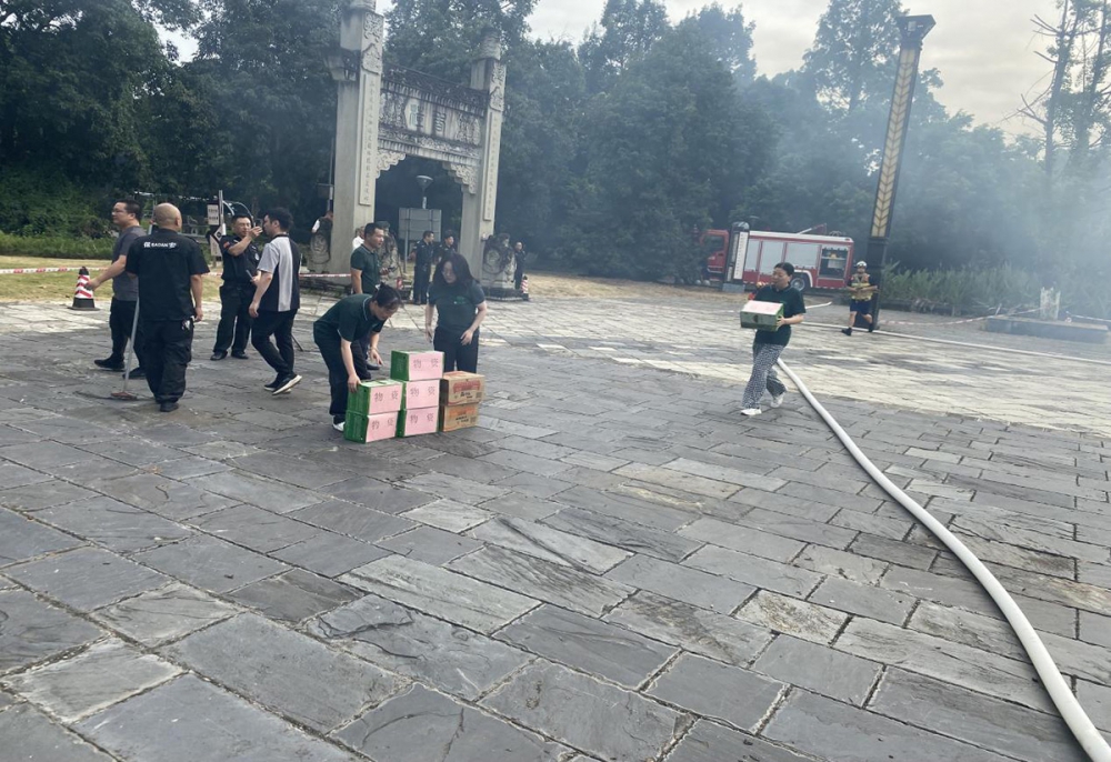 本次演练模拟张坝桂圆林桂香广场突发火情,有工作人员与游客被困及受伤为背景,设置8个演练科目,涉及防火巡查、值班上报、抢险救援、疏散转移、医疗救援、舆情监测和无人机勘察等多个环节,重点检验一线人员防火安全意识、值班人员履行值班职责、指挥部统筹调度、应急队伍联动、科技装备运用、常规物资储备应急等综合能力。以下是本次演练的精彩集锦: